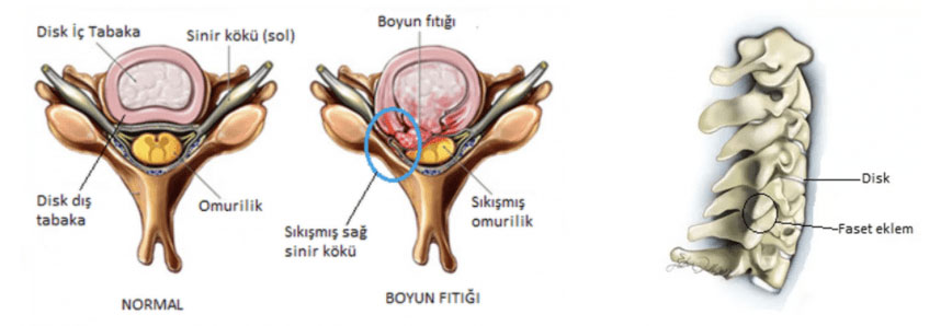 Boyun fıtığı, yetişkinlerdeki boyun ağrısının yaygın bir nedenidir. Boyun bölgesinde bir sinire bası gerçekleştirdiğinde boyun ağrısı, kolda ağrı, uyuşukluk, karıncalanma veya yanma hissi, kollarda elektrik çarpması hissi ve kaslarda spazmlar olabilir. Hatta ilerleyen düzeylerde güç kaybına yol açabilir. Servikal disk hernisinin doğrudan omuriliğe bası yapan formlarında ise bacaklarda da bulgular ve denge problemleri ortaya çıkabilir.