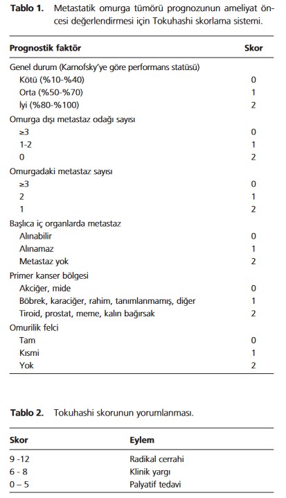 Metastatik Spinal Tümörlerin değerlendirilmesi: Pratikte metastatik spinal kitleler sık görülür. Hangisi operasyondan yarar görecek hangisi görmeyecek sorusunu cevaplamak için Tokuhashi Prognoz Skorlaması kullanılmaktadır.